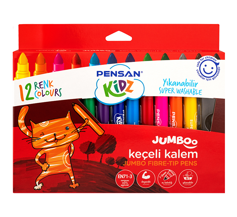 Pensan Jumbo Keçeli Kalemi çocukların sağlığı dikkate alınarak yüksek kalite standartlarında üretilmiştir. Canlı renkleri ve çeşitleri ile çocukların eğlenerek öğrenmesini sağlarken hayal güçlerinin de gelişmesine yardımcı olur. Kapağı 15 gün boyunca kapağı açıkken kurumaz. Yıkanabilir. Ucu basınca dayanıklıdır ve kaliteli bir boyama sağlar. Konforlu ve ergonomik bir tutus için yuvarlak bir tasarıma sahiptir. Konfor, sadelik ve yüksek performans arayan tüketicilerimizi Pensan Kidz Keçeli Kalemlerinin modern tarzı ile buluşturuyoruz.
